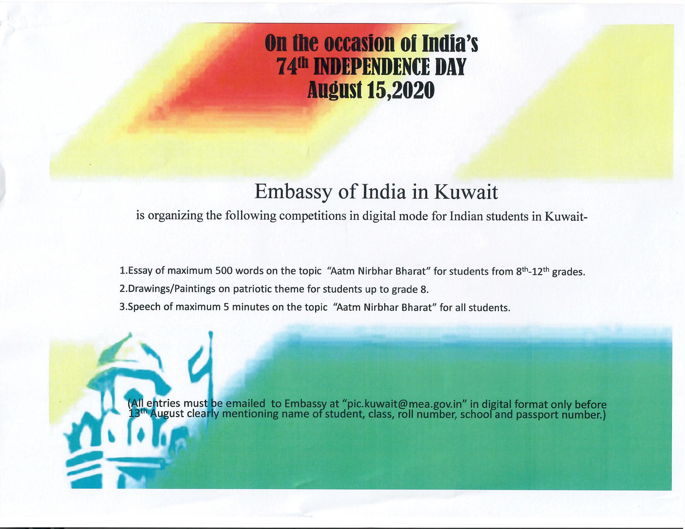 Essay Drawing Speech Competitions In Digital By Indian Embassy Kuwait 74th Independence Day Indianinq8 Iiq8 Jobs News Accommodation - You can organise such competition on independence day too.